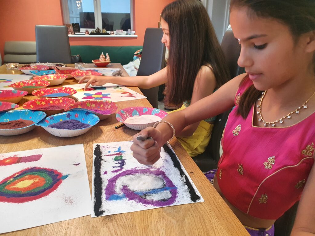 My parents always lit diyas (small candles) for the five days of Diwali, and I have continued that tradition. Over time, my husband and I have started hosting Diwali parties. We invite friends from all backgrounds, making Diwali a special celebration that brings us all together. We make rangoli (traditional Indian floor art), decorate the house, serve food, play games, exchange gifts, and enjoy fireworks and sparklers – it’s a joyful gathering centred around light. The diyas are at the centre of it, symbolising goodness and light coming into the home.